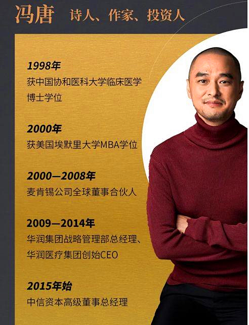 xxxxxxxxxx冯唐,医学博士、前麦肯锡全球董事合伙人、华润集团创始CEO、中信资本高级董事总经理、诗人、作家、投资人。著有长篇小说《18岁给我一个姑娘》、《万物生长》、《北京,北京》等,散文集《活着活着就老了》、《春风十里不如你》等。