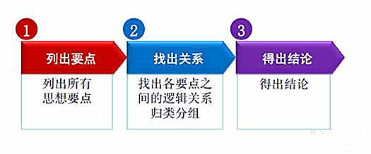 列出可能想到的所有要点; 找出关系,进行要点归纳; 得出结论; 检查逻辑严谨性