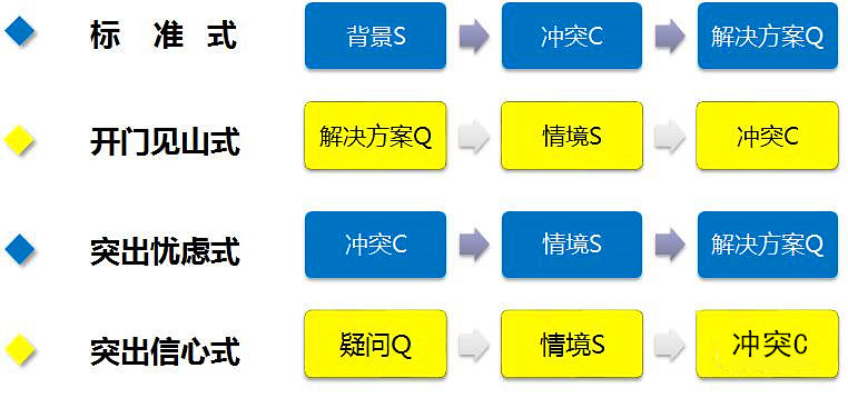 (4)SCQA基本结构 明托认为序言必须采取“背景-冲突-疑问-解决方案”的结构,各个部分的顺序可以有所变化,以创造不同的文章风格。以下是序言的四种基本结构: