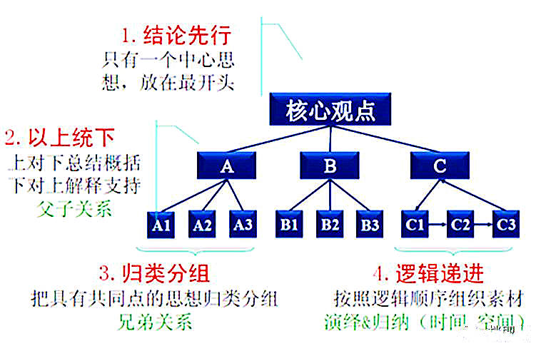 任何事情都可归纳出一个中心论点,中心论点可由三至七个论据支持,这些论据本身也可是个分论点,被三至七个论据支持,如此延伸状如金字塔。